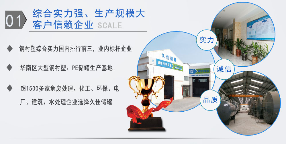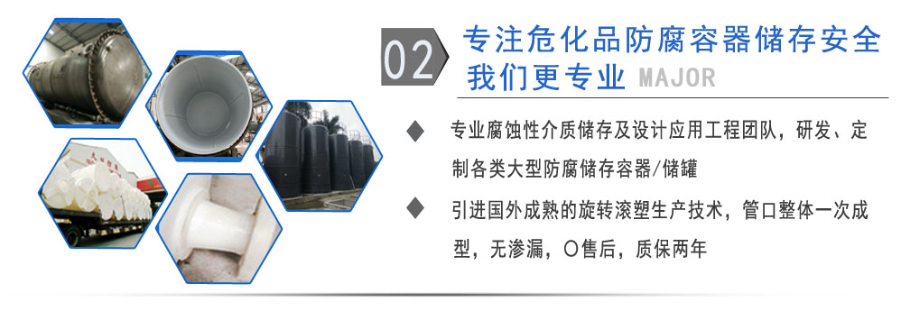 公司有鋼襯塑PE/PO、PE全塑、碳鋼、不銹鋼四大系列100多個品種,專注于常壓儲存容器生產,其產品包括鋼襯塑儲罐、管口一體成型PE儲罐碳鋼儲罐、不銹鋼儲罐、反應釜、攪拌罐、離子交換柱、鋼襯PE/PO儲罐塑料儲罐、鹽酸儲罐、硫酸儲罐等等。更大限度滿足廣大客戶的各種需求,同時可以根據客戶的需要加工定制各種防腐設備。